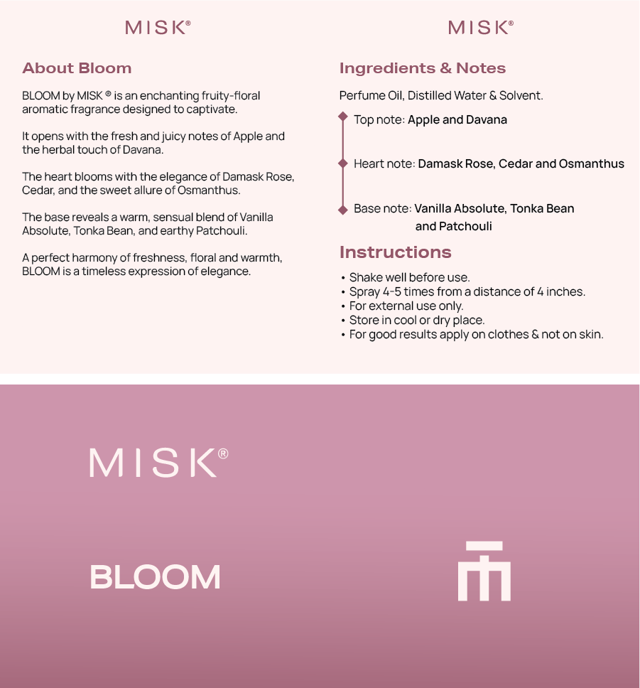 BLOOM by MISK ® is an enchanting fruity-floral aromatic fragrance designed to captivate. It opens with the fresh and juicy notes of Apple and the herbal touch of Davana. The heart blooms with the elegance of Damask Rose, Cedar, and the sweet allure of Osmanthus. The base reveals a warm, sensual blend of Vanilla Absolute, Tonka Bean, and earthy Patchouli. A perfect harmony of freshness, floral and warmth, BLOOM is a timeless expression of elegance.