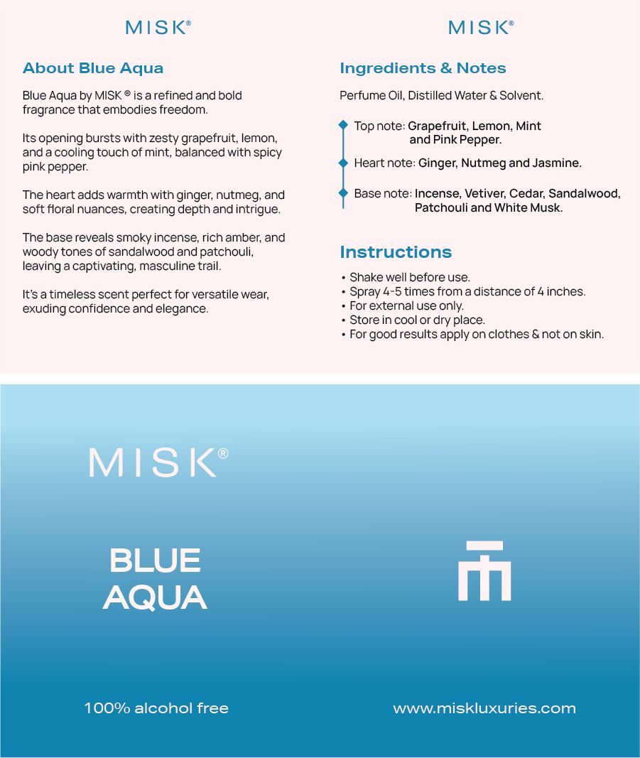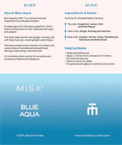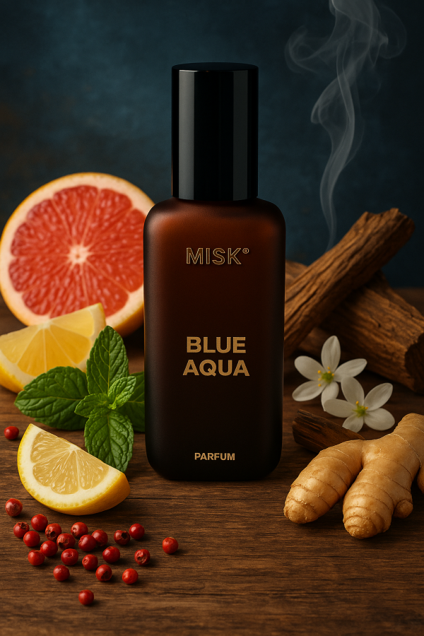 BLUE AQUA by MISK ® is a refined and bold fragrance that embodies freedom. Its opening bursts with zesty grapefruit, lemon, and a cooling touch of mint, balanced with spicy pink pepper. The heart adds warmth with ginger, nutmeg, and soft floral nuances, creating depth and intrigue. The base reveals smoky incense, rich amber, and woody tones of sandalwood and patchouli, leaving a captivating, masculine trail. It’s a timeless scent perfect for versatile wear, exuding confidence and elegance.