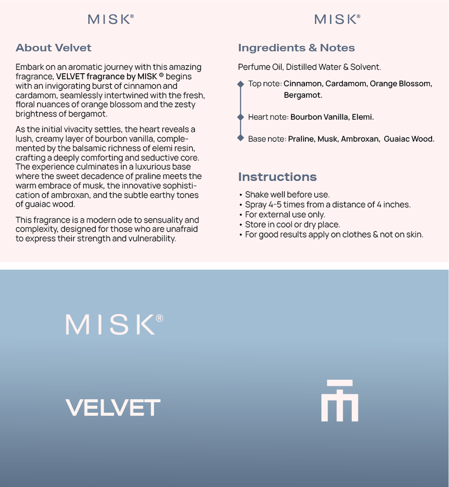 Embark on an aromatic journey with this amazing fragrance, VELVET fragrance by MISK ® begins with an invigorating burst of cinnamon and cardamom, seamlessly intertwined with the fresh, floral nuances of orange blossom and the zesty brightness of bergamot. As the initial vivacity settles, the heart reveals a lush, creamy layer of bourbon vanilla, complemented by the balsamic richness of elemi resin, crafting a deeply comforting and seductive core. The experience culminates in a luxurious base where the sweet decadence of praline meets the warm embrace of musk, the innovative sophistication of ambroxan, and the subtle earthy tones of guaiac wood. This fragrance is a modern ode to sensuality and complexity, designed for those who are unafraid to express their strength and vulnerability.