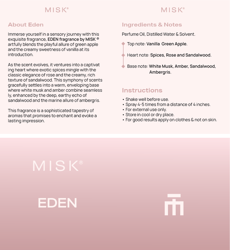 Immerse yourself in a sensory journey with this exquisite fragrance, EDEN fragrance by MISK ® artfully blends the playful allure of green apple and the creamy sweetness of vanilla at its introduction. As the scent evolves, it ventures into a captivating heart where exotic spices mingle with the classic elegance of rose and the creamy, rich texture of sandalwood. This symphony of scents gracefully settles into a warm, enveloping base where white musk and amber combine seamlessly, enhanced by the deep, earthy echo of sandalwood and the marine allure of ambergris. This fragrance is a sophisticated tapestry of aromas that promises to enchant and evoke a lasting impression.